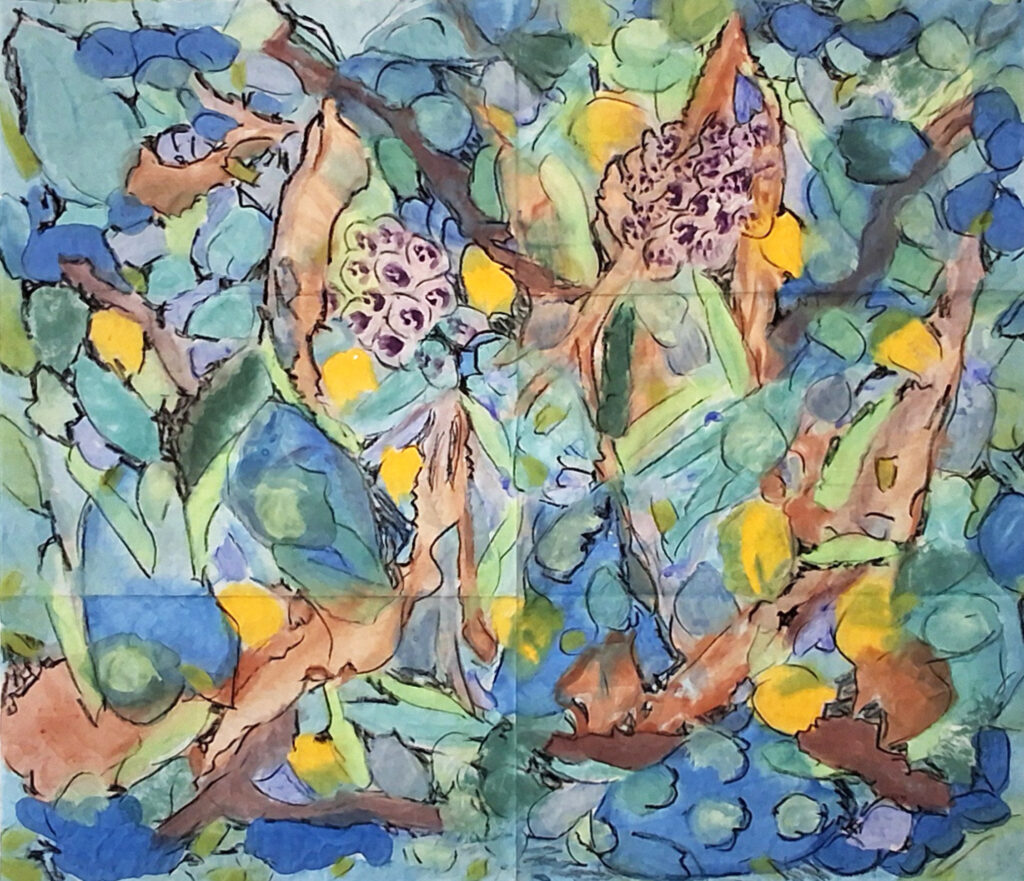 Jungle aug. 24 (blauw), Acryl, o.i. inkt, op rijstpapier 110 x 69 cm, 2024